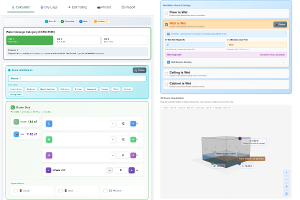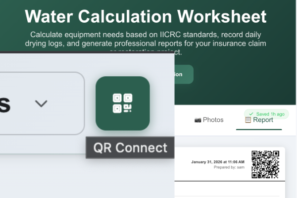 Use our water damage calculator to document affected areas, calculate equipment needs, and generate a professional assessment report right from your phone or tablet.